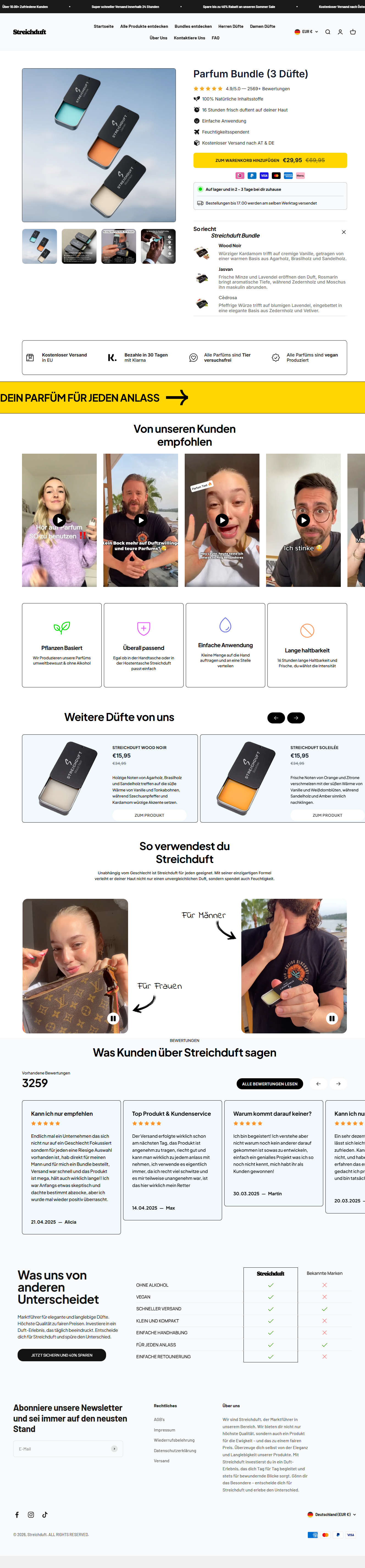 Editorial-Style Shopify PDP für Streichduft — eine Nischen-Parfum Brand, deren Online-Auftritt genauso premium sein muss wie das Produkt selbst.
