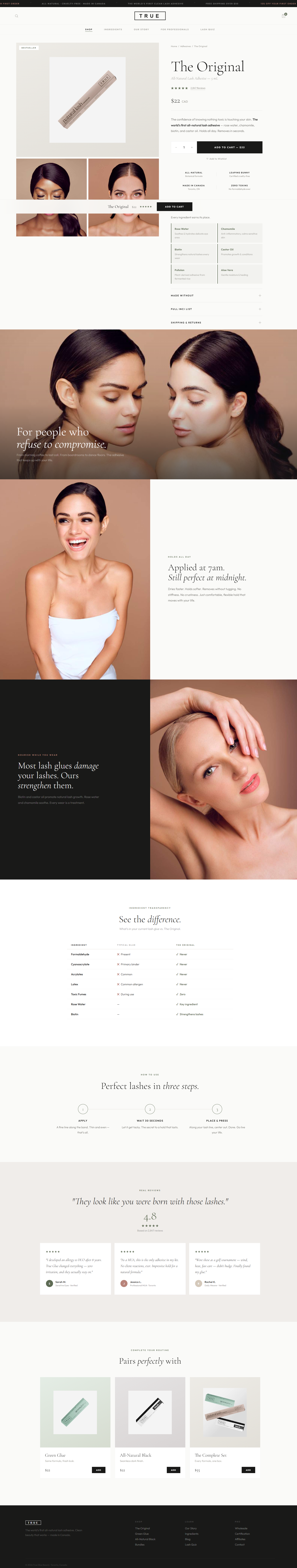 TrueGlue hatte ein starkes Produkt (natürlicher Wimpernkleber), aber die Produktseite kommunizierte die Vorteile nicht klar genug. Die Collection Page war eine Standard-Grid-Ansicht ohne Differenzierung.